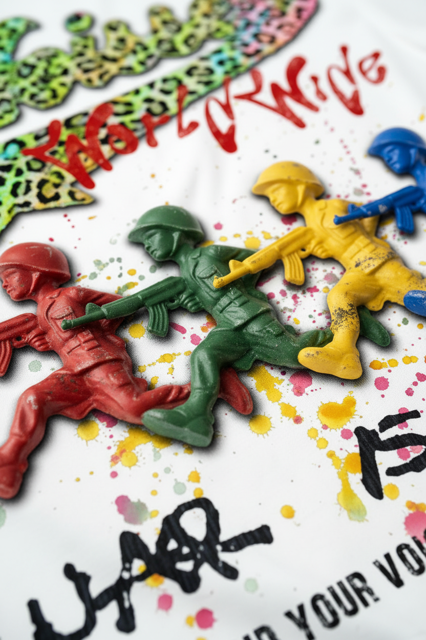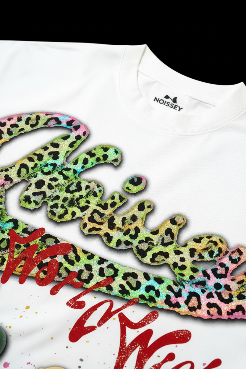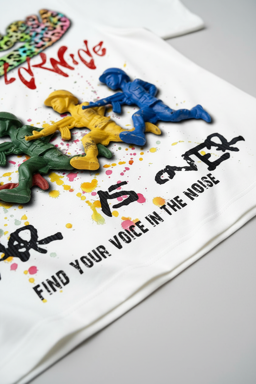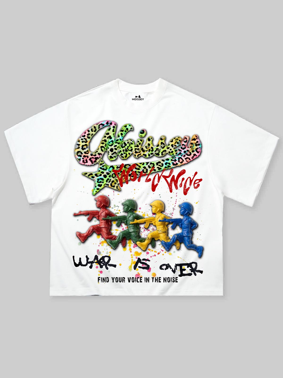 The Hook: A vibrant subversion of classic military imagery. This Oversized Relaxed Tee features the "NOISSEY WORLDWIDE" logo rendered in a high-octane neon leopard print with a bold 3D chrome effect. Below, a lineup of "Toy Soldiers" in primary red, green, yellow, and blue marches across a splattered paint backdrop, reimagining childhood nostalgia through a gritty, urban lens. Anchored by the powerful "WAR IS OVER" graffiti tag and the brand’s mission statement "Find your voice in the noise," this piece is a masterpiece of pop-art rebellion for the modern streetwear collector.