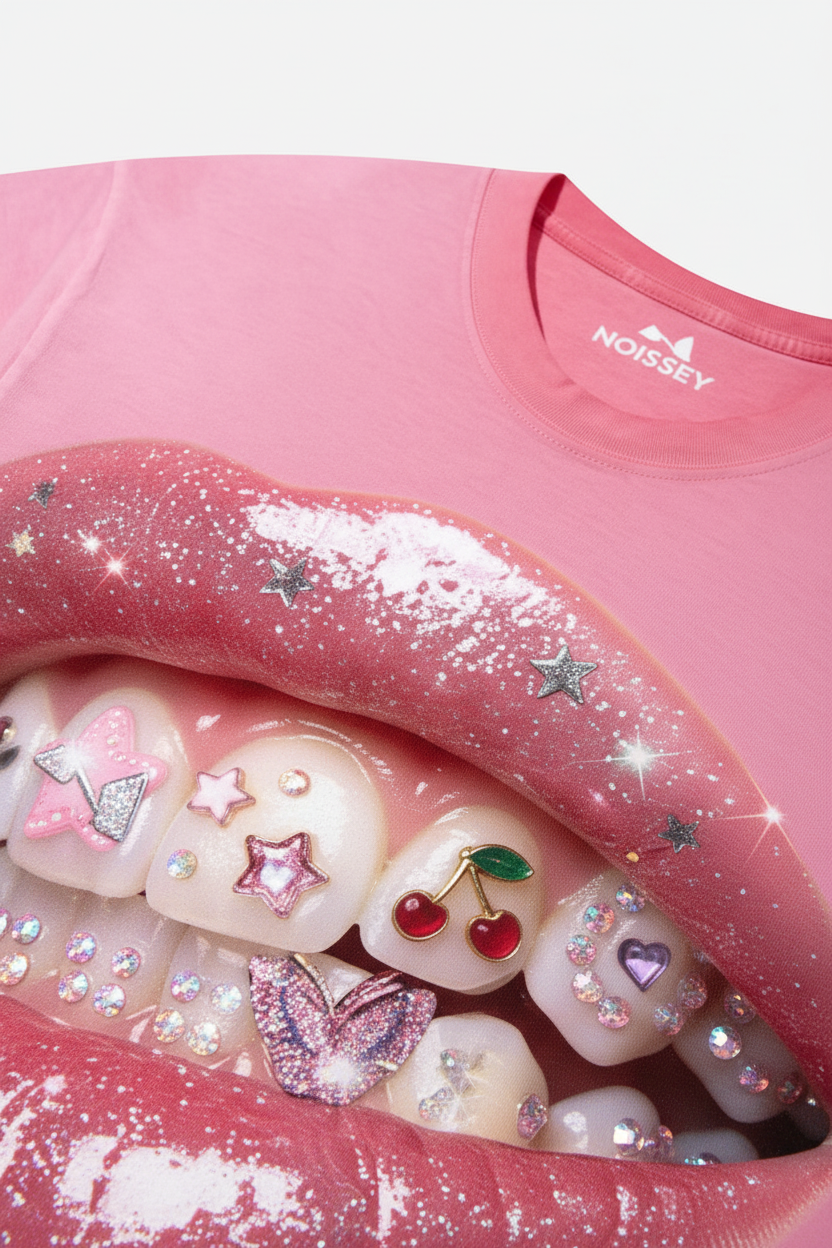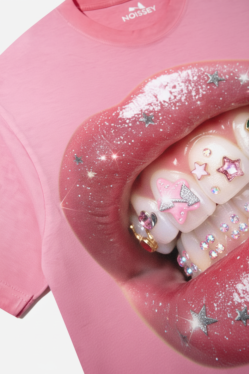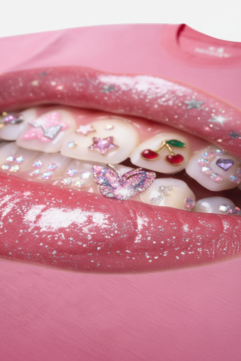 Pink Lip Gloss Shiny Rhinestone Washed Print T-shirt