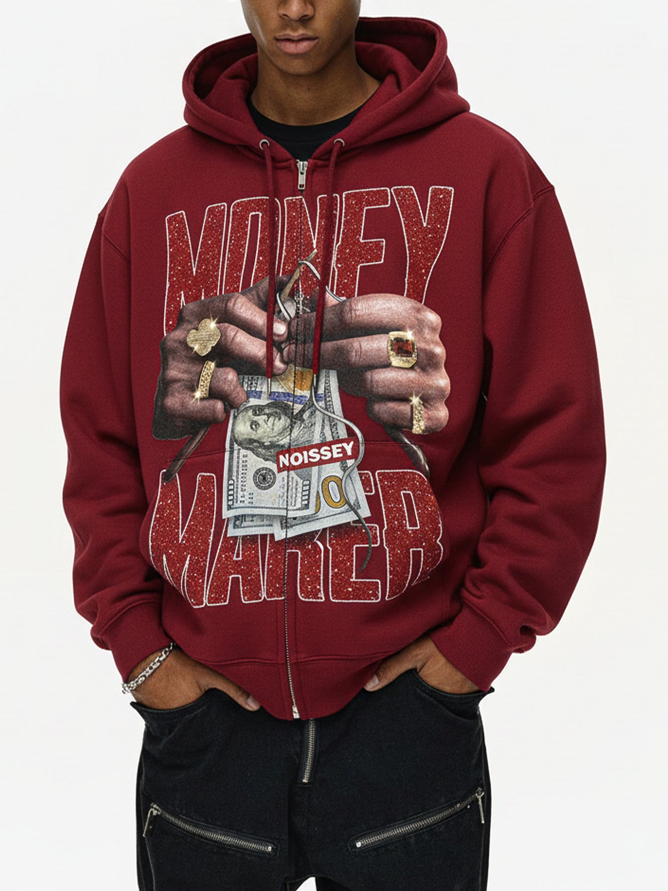 The NOISSEY "Money Maker" Zip-Up is designed for those who speak the language of success. Drenched in a rich Deep Red / Burgundy hue, this hoodie features a graphic of hands counting a stack of blue $100s, overlaid with sparkling rhinestone "MONEY MAKER" text.
