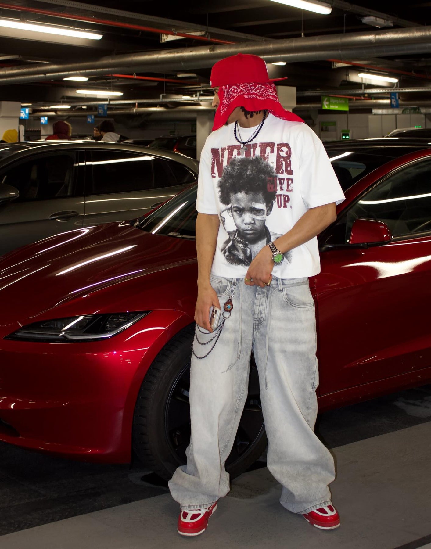 The NOISSEY "Never Give Up" Tee is a wearable manifesto for the relentless. The graphic features a powerful vintage-style portrait of a young boxer, battered with bandages but still standing, gloves raised. Framed by bold, distressed crimson typography, it’s a reminder that the hustle never stops.