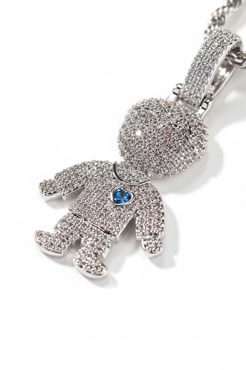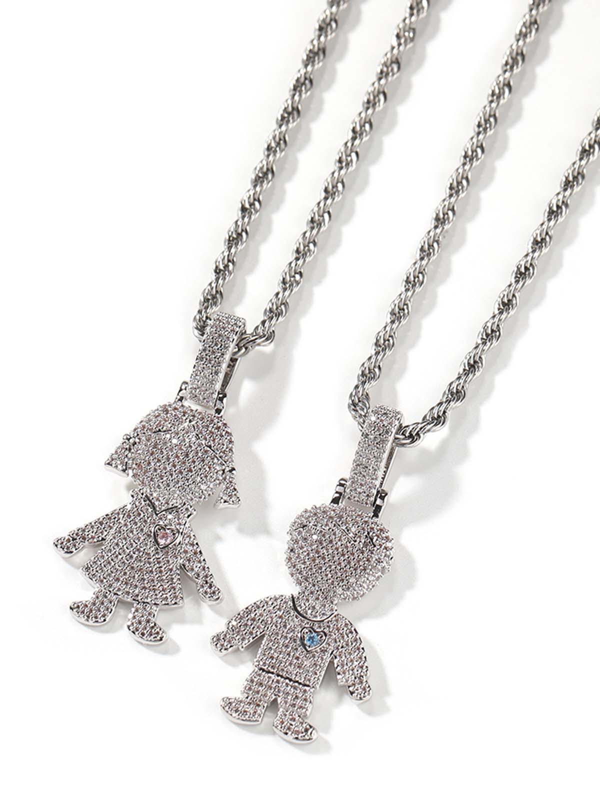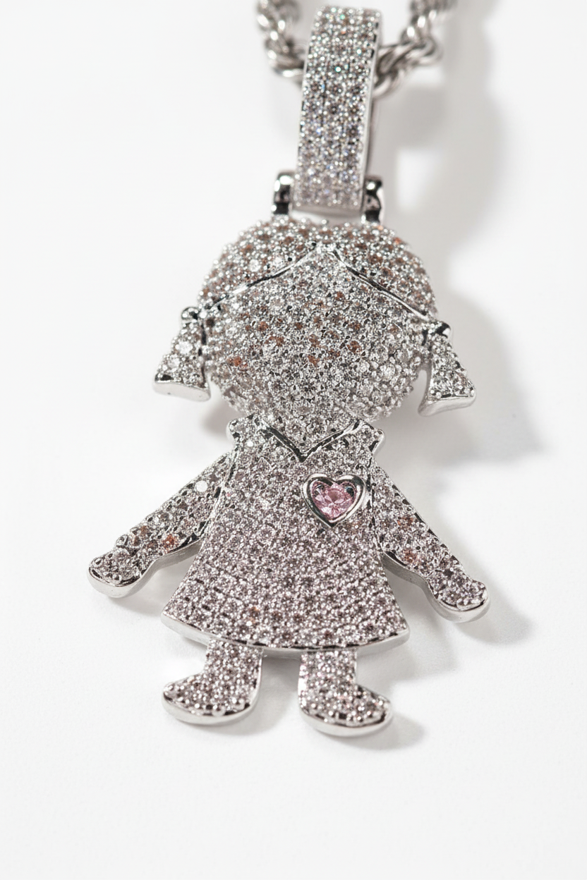 "Heart Core" Detail: A colored heart-shaped zircon is masterfully embedded in the character’s chest (pink for the girl, blue for the boy), adding a vibrant soul of color to the iced-out profile.