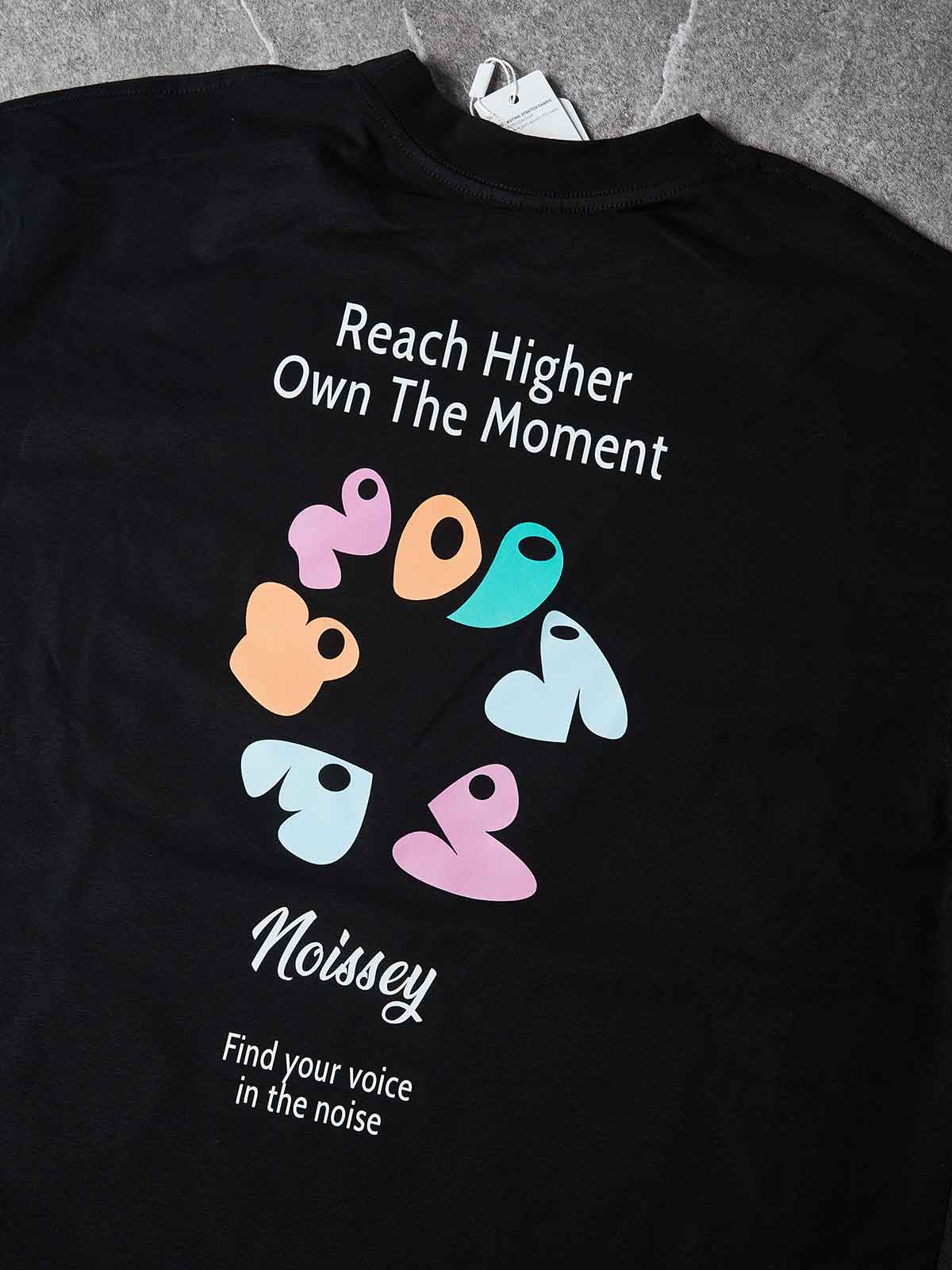 The Hook: Minimalism in the front, artistic deconstruction in the back. This Oversized Tee features a clean, understated chest logo on the front, while the reverse side reveals a vibrant transformation of the "NOISSEY" identity. Reimagined as a modular, jungle-gym-inspired structure, the geometric back graphic uses a high-contrast palette of teal, coral, and violet to symbolize urban exploration. Anchored by the manifestos "Reach Higher, Own The Moment" and "Find your voice in the noise," this piece perfectly balances low-key street style with a bold, philosophical statement.