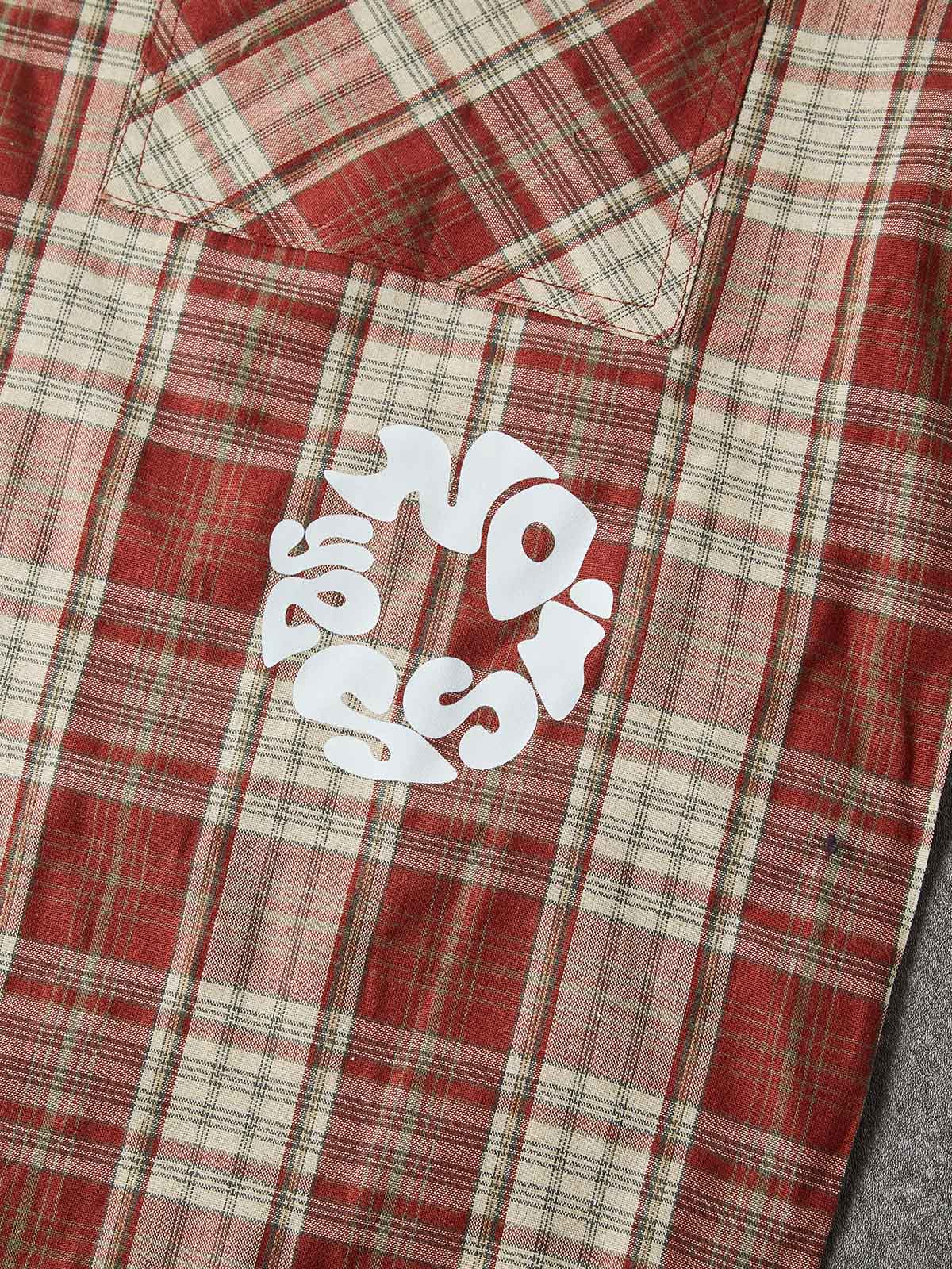 The Hook: A rhythmic remix of heritage plaid. This short-sleeve button-down utilizes a warm "Terracotta" red and cream checkered pattern as a canvas for a series of bold, circular graphic interventions. Featuring the "Noissey" brand name warped into high-contrast white circular scripts, the print is scattered across the front in a dynamic, non-linear arrangement. It’s a piece that honors the timeless appeal of the flannel shirt while injecting a sense of modern, kinetic energy into the silhouette.