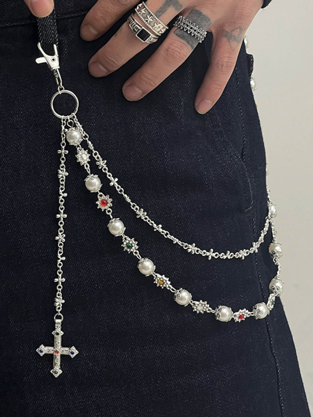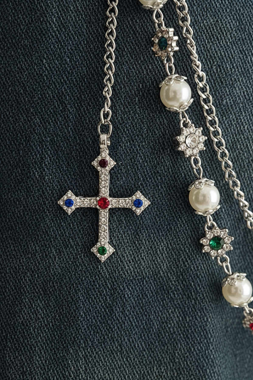 The Hook: A masterclass in intricate streetwear layering. This premium accessory features three distinct strands of silver-toned hardware, alternating between classic curb links and a delicate strand of white pearls interspersed with colorful gemstone floral charms. Anchored by a detailed Gothic crucifix pendant, it brings a "Vibe" that is both rebellious and refined, perfect for elevating any denim look.
