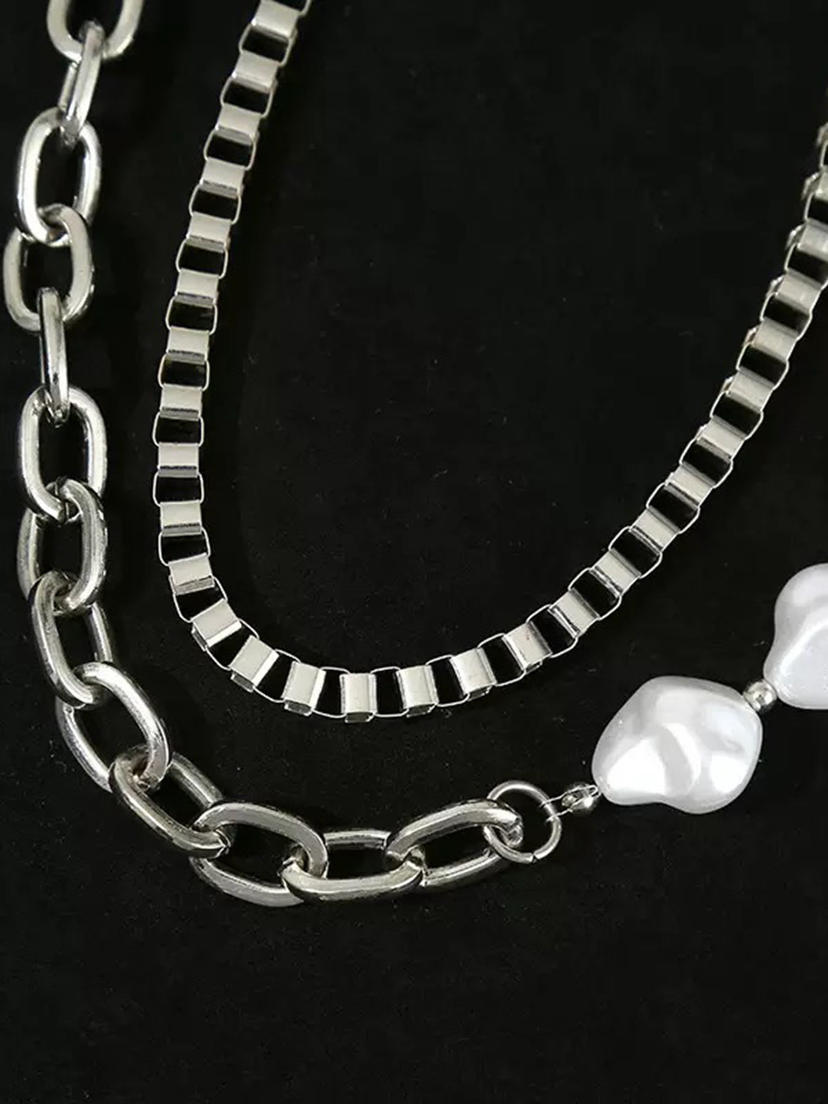 Design: Multi-Textured Layering — combines a chunky industrial chain with a delicate pearl strand to provide dynamic visual movement when walking.