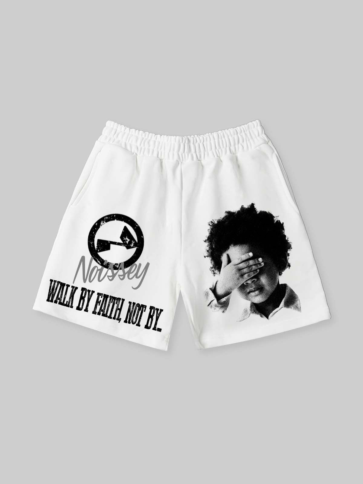 • The Hook: A visual meditation on inner vision and spiritual resilience. These heavyweight white sweat shorts feature a stark, high-contrast portrait of a child covering their eyes, paired with the iconic scripture: "WALK BY FAITH, NOT BY SIGHT". Utilizing a distressed, "hand-stamped" printing aesthetic, this piece balances underground grit with a profound message, making it a cornerstone for a meaningful summer wardrobe.
