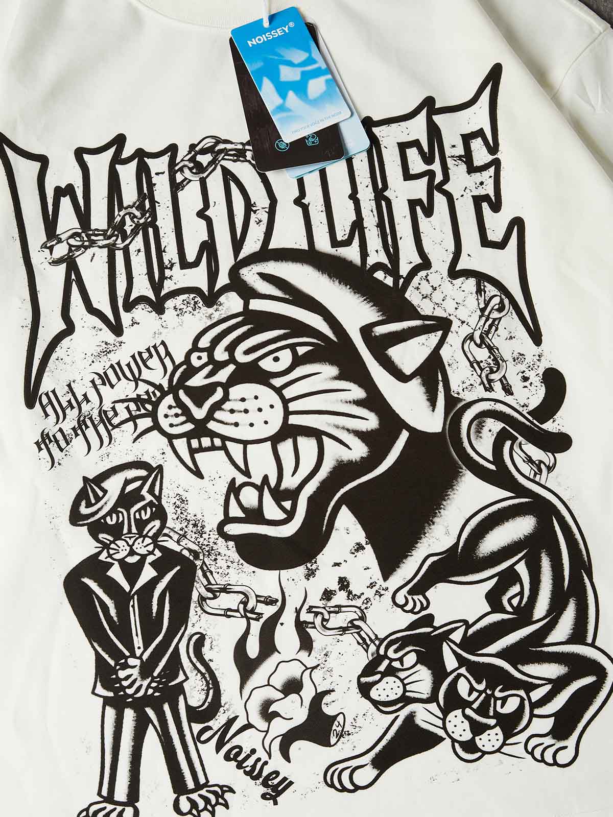 Size Recommendation: Take your standard size for the intended relaxed look. The clean white canvas makes the bold black-and-white tattoo motifs and the leopard-print sleeve details pop with high-contrast energy.