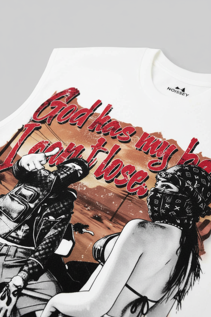 NOISSEY "GOD HAS MY BACK" DESERT MOTO CULTURE GRAPHIC TANK TOP