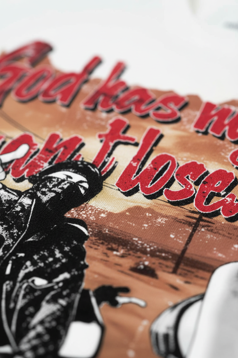 The Hook: Faith in the dust. Destiny in the desert. This high-concept Tank Top captures the raw adrenaline of off-road racing. Featuring a gritty cinematic graphic of a masked rider and a desert silhouette, the design is defined by the defiant crimson manifesto: "God has my back, I can't lose". Blending heavy street aesthetics with high-octane moto culture, it’s a statement of divine confidence for those who blaze their own trails through the noise.