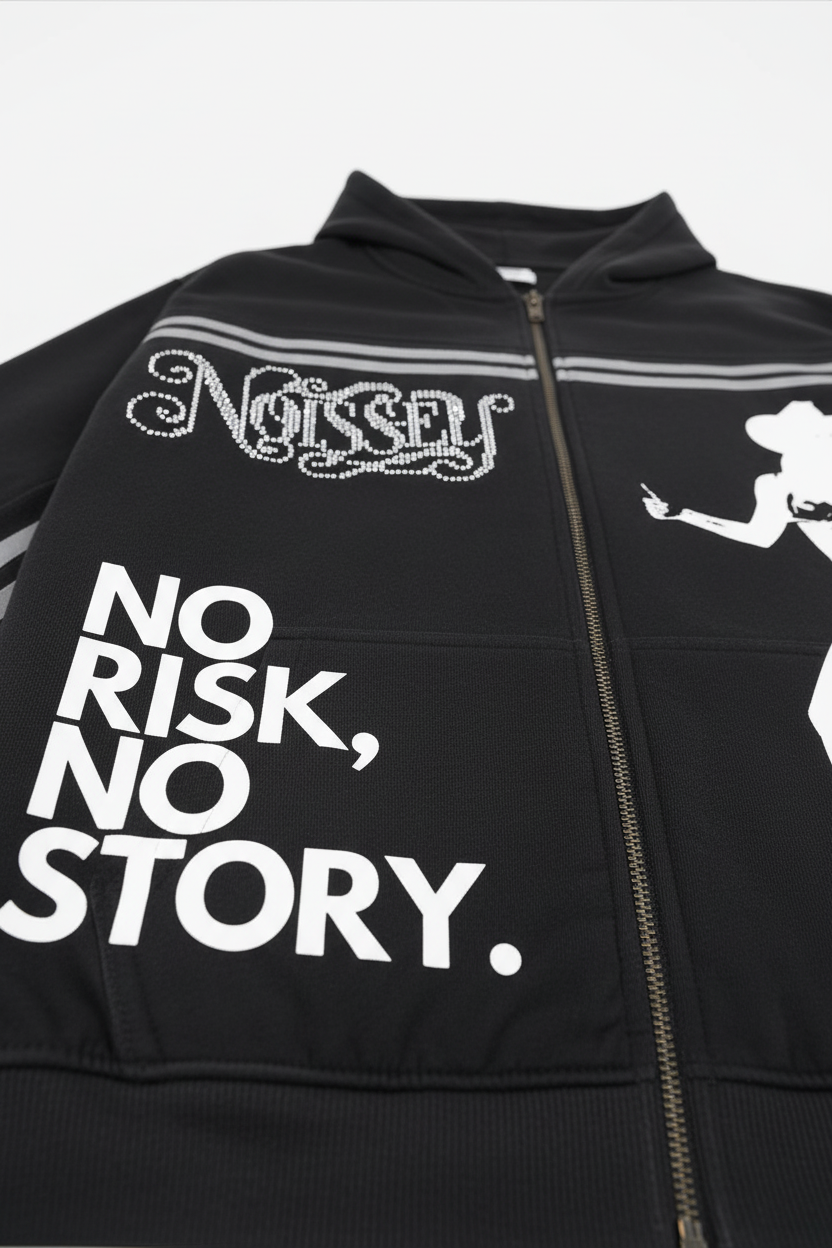 Faith in the hustle. A visual manifesto for the bold. This zip-up hoodie features a raw graffiti-style "NO RISK NO STORY" statement, fully elevated with high-luster rhinestone embellishments that command attention. Merging the gritty soul of underground street art with a premium luxury finish, it’s a piece designed for those who play it big and tell the tale.