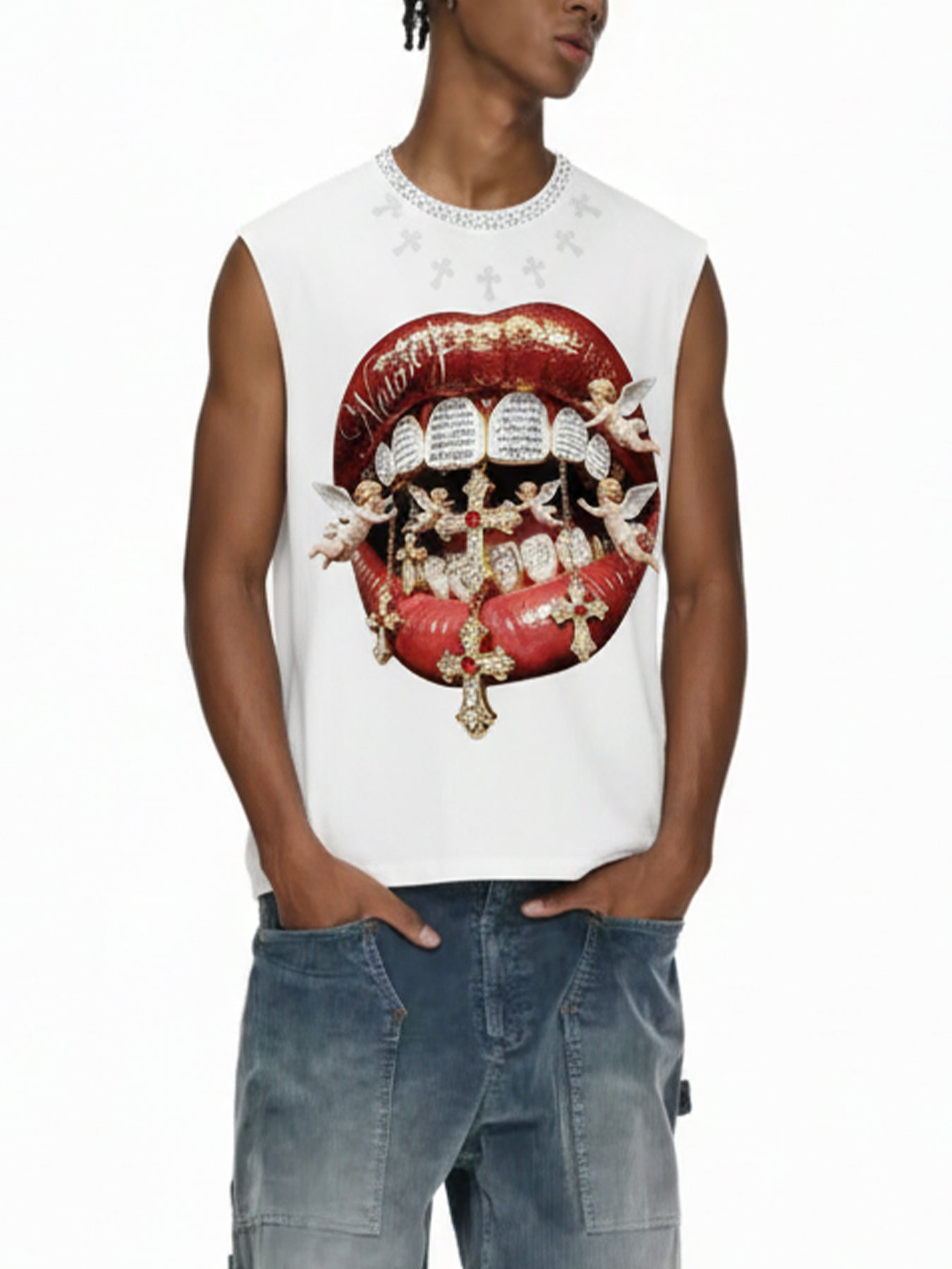 The Hook: Faith in the luxury. Divinity in the details. This high-impact Tank Top features a cinematic graphic of a ruby-red "Iced Out" lip. Within its diamond-encrusted fangs, a group of celestial cupids support a radiant Gold & Ruby Cross. Blending baroque religious symbolism with aggressive modern street aesthetics, this piece is crafted from our signature heavyweight composite fabric for a silhouette that is as divine as it is powerful.