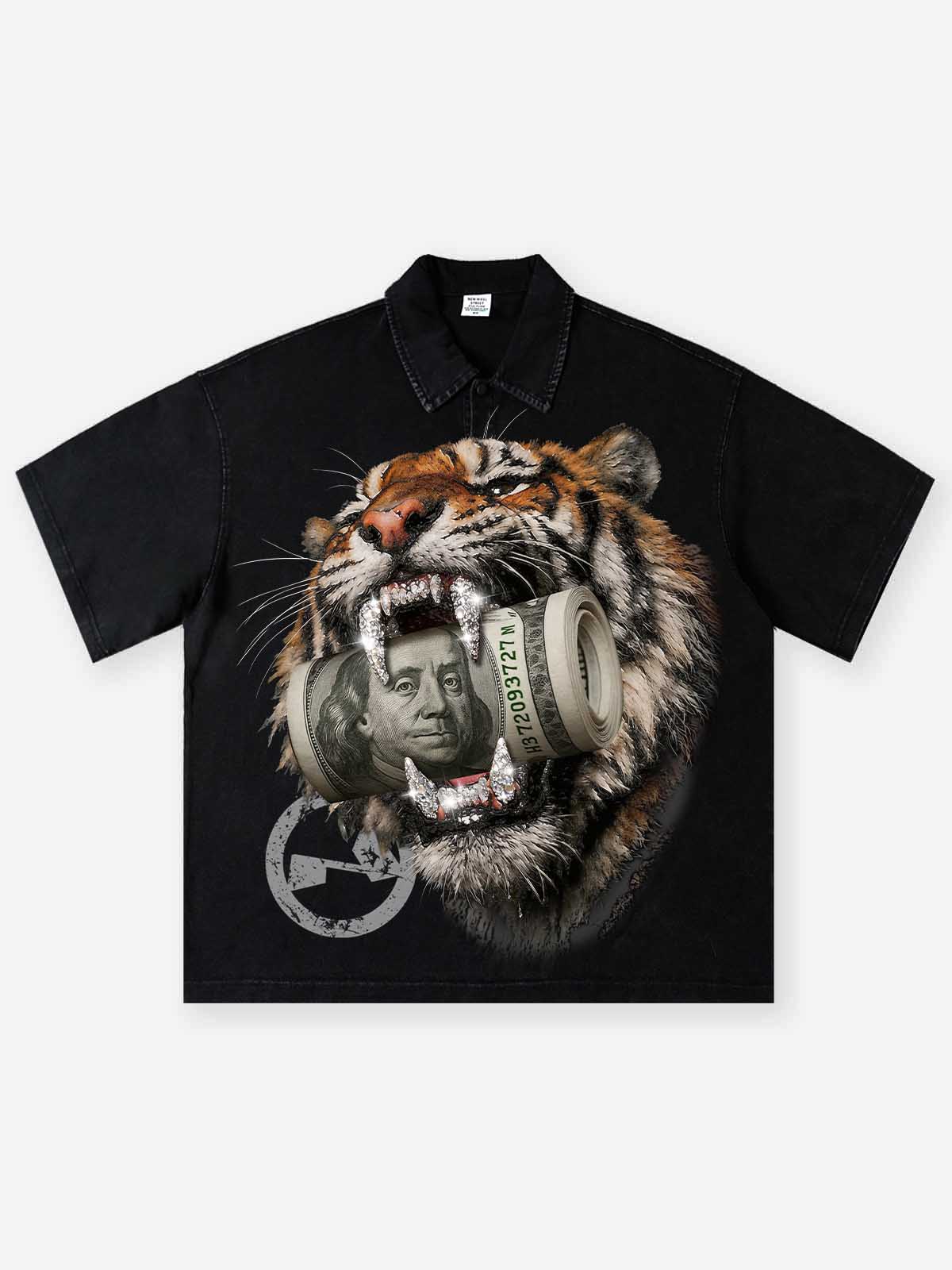 The Hook: Faith in the wild. Hustle in the jungle. This piece features a high-octane fusion of camouflage and leopard textures, centered by a provocative "Money Mouth" Grills graphic. Hand-applied DIY shimmering accents add a layer of raw luxury to this urban predator aesthetic.