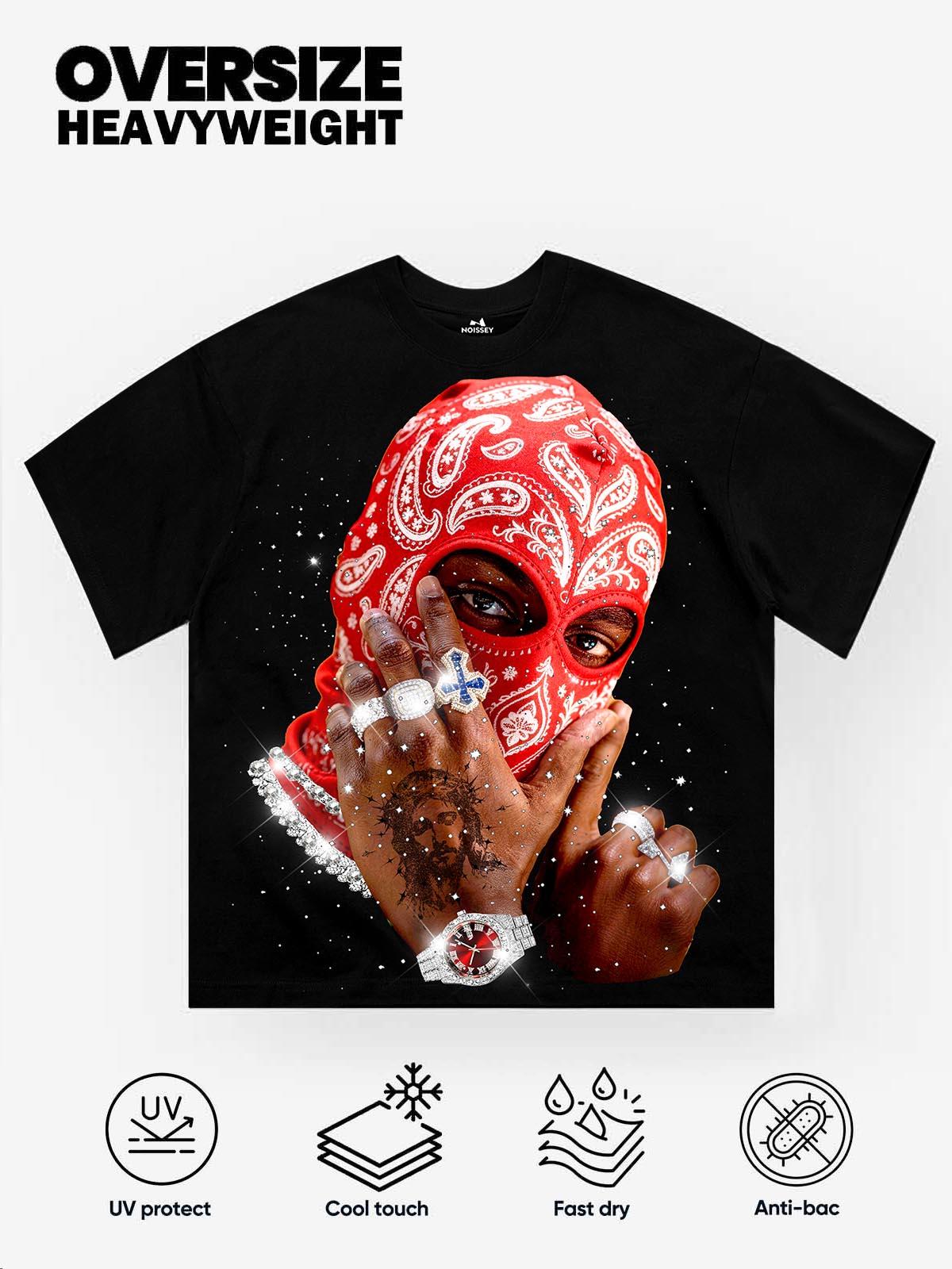 The Hook: Faith in the wild. Creativity in the culture. This standout piece features a hyper-realistic back graphic of intricate braids adorned with vibrant red bottle caps and shimmering diamond-like accents. It’s a bold celebration of street ingenuity and DIY luxury, turning everyday objects into a high-fashion statement.