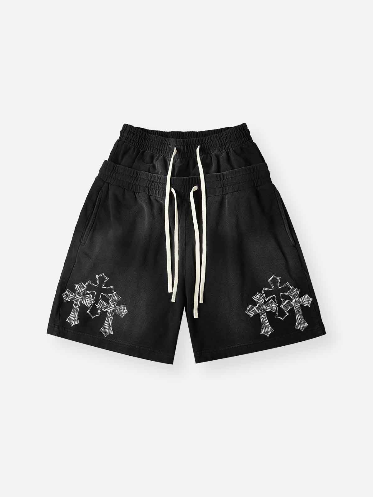 NOISSEY VINTAGE BLACK RHINESTONE CROSS CLUSTER GRAPHIC SHORTS