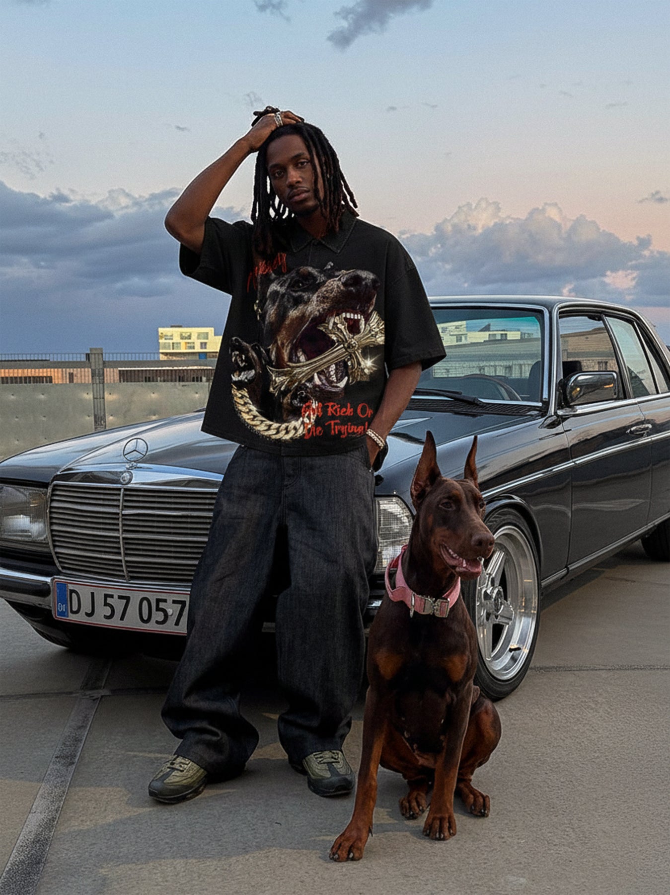 The Hook: Faith in the wild. Ambition in the bite. This high-impact black shirt features a cinematic graphic of a fierce Doberman clenching a shimmering golden crucifix. Emblazoned with the defiant red slogan "Get Rich Or Die Trying!" and accented with iced-out Cuban links and ear piercings, this piece embodies the raw hustle and spiritual grit of the urban landscape. It’s more than a shirt; it’s a manifesto of relentless pursuit.