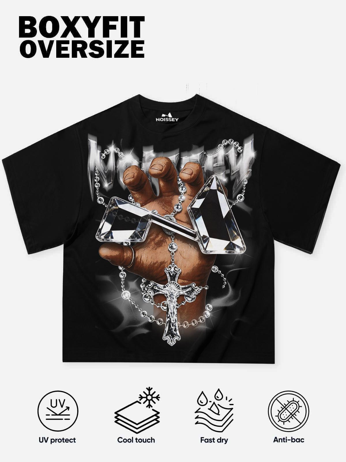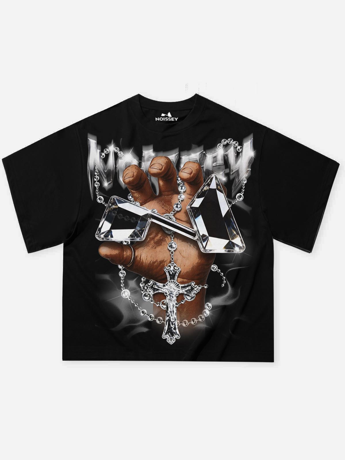 The Hook: Faith is power. Luxury is attitude. This heavyweight oversized tee drops on a pure jet black canvas, delivering a striking hyper-realistic art print — a pair of praying hands clutching two cut crystal diamonds, a rosary and crucifix cascading below, all wrapped in a smoky atmospheric backdrop that fuses the sacred with the streets. A chrome liquid-metal "Noissey" wordmark anchors the chest, where religious iconography collides with luxury aesthetics to define the modern streetwear spirit.