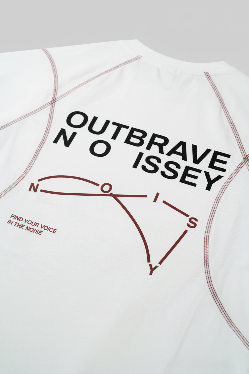 This white short-sleeve T-shirt features a simple yet unique design. Red stitching accents the details, while the back print "OUTBRAVE N O ISSEY" and noise trail pattern embody a fearless spirit. Made from soft, comfortable fabric, it's suitable for various occasions. Wear it to boldly express your true self.