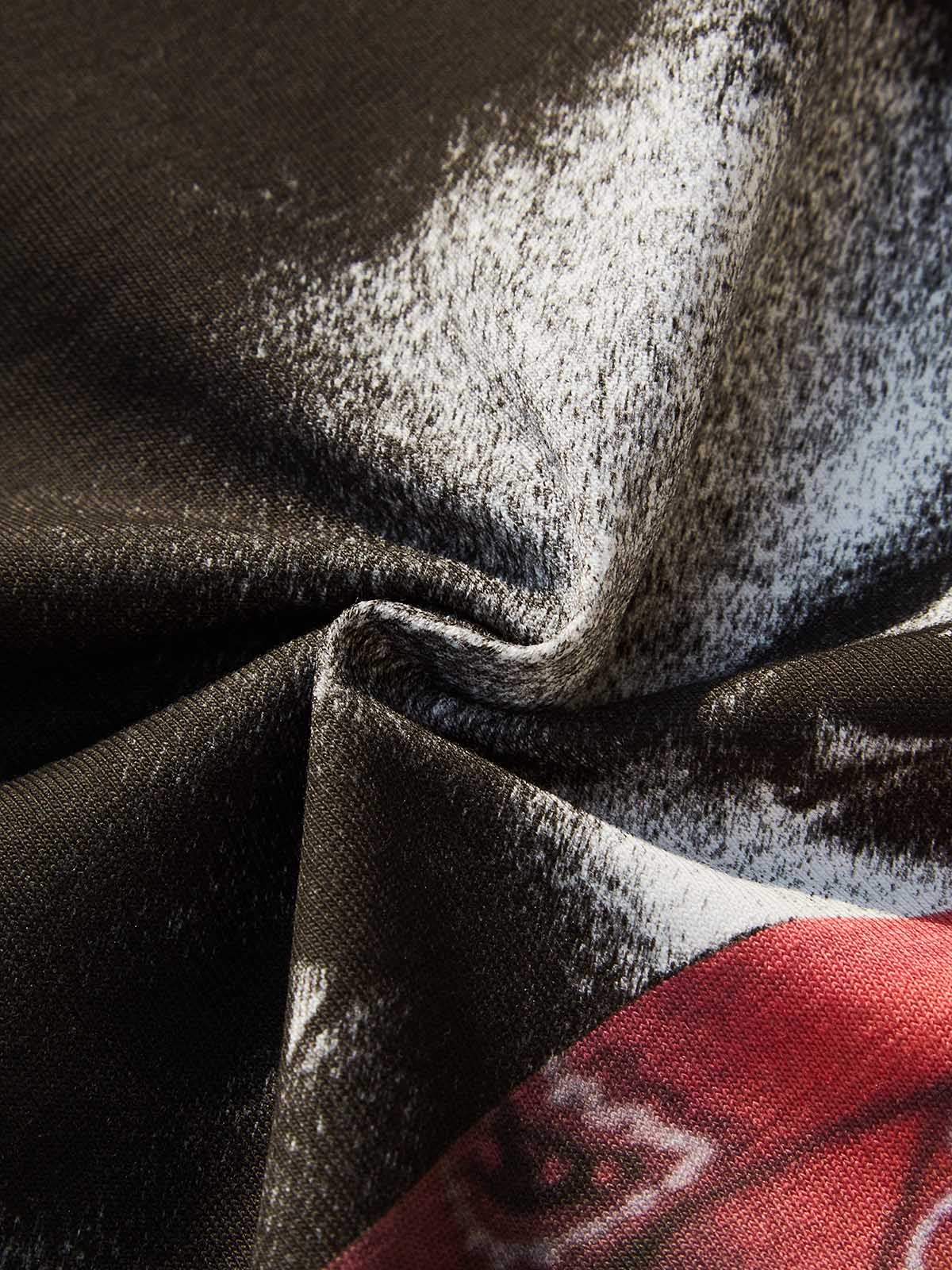 Close-up of high-quality screen print on t-shirt showing the detailed red bandana and artistic child expression.