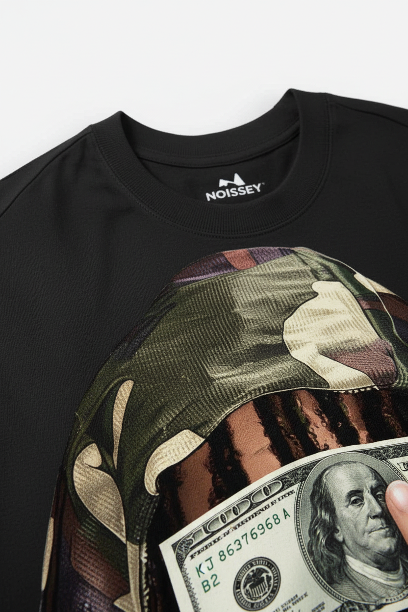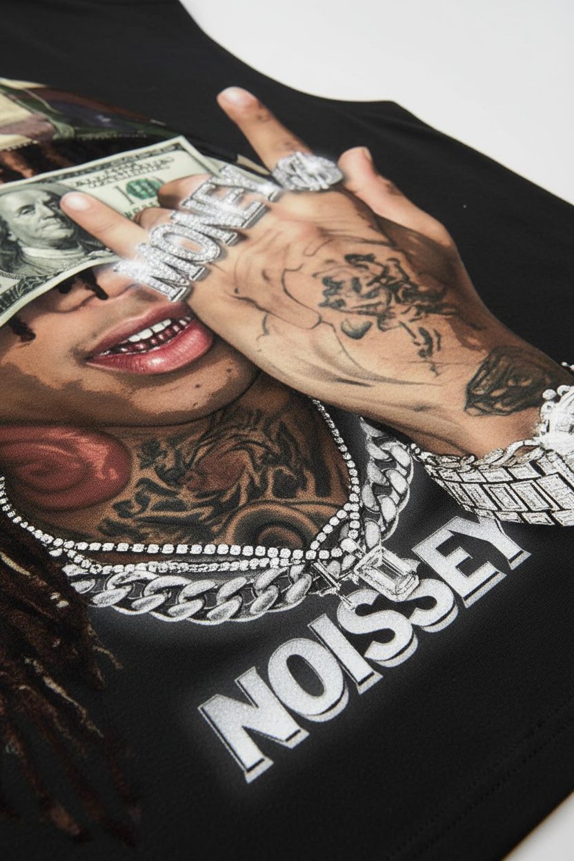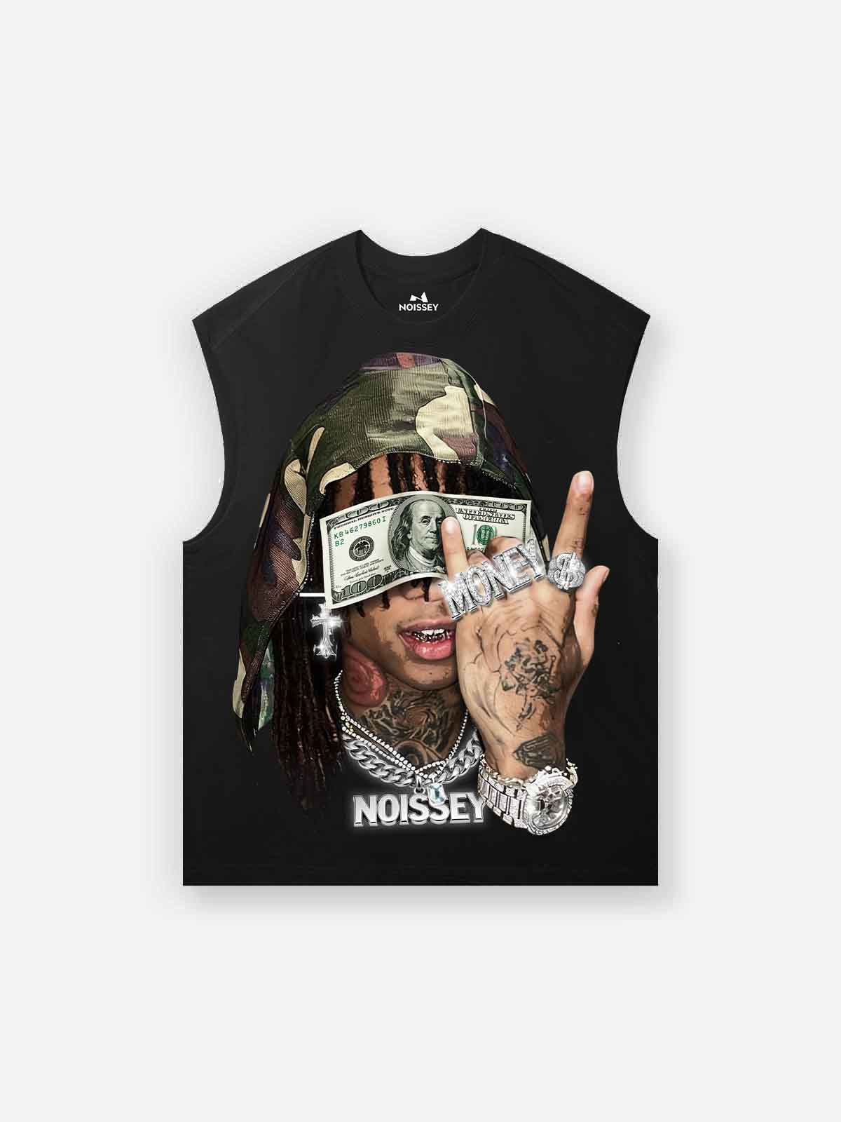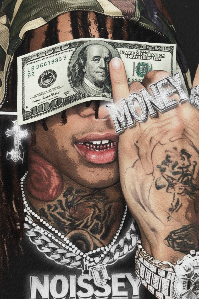 The Hook: Faith in the wild. Focus on the fortune. This cinematic Tank Top features a striking graphic of a figure in a camo-print bandana, eyes obscured by a $100 bill—a raw symbol of unwavering hustle. Adorned with shimmering "Iced Out" star-light details on the diamond-encrusted watch, rings, and heavy Cuban links, this piece captures the high-stakes energy of urban luxury. It’s a bold visual statement about vision, success, and the relentless pursuit of the crown.