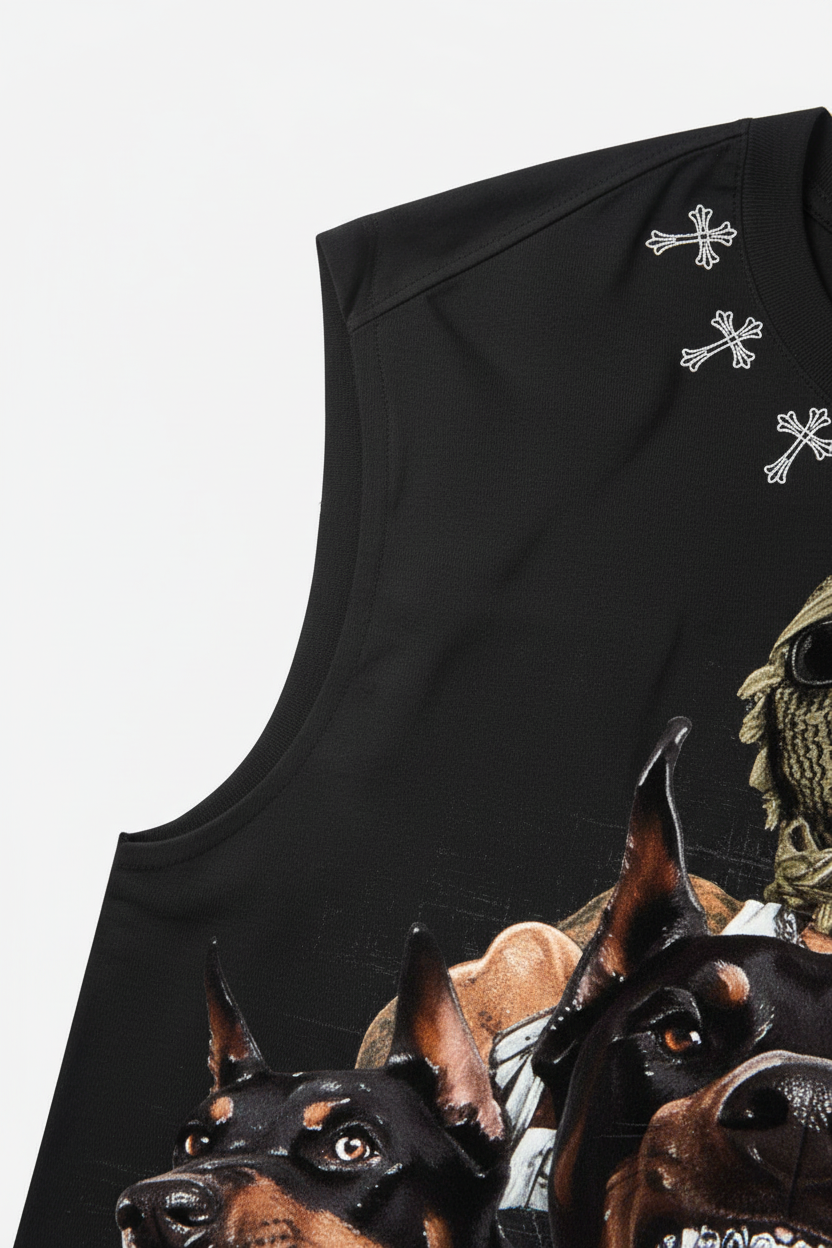 The Hook: Faith in the pack. Power in the glint. This high-impact Tank Top features a cinematic graphic of three snarling Dobermans, meticulously rendered with iced-out diamond collars and fangs, guarding a radiant cross. The backdrop subtly weaves in texture from a hundred-dollar bill, creating a narrative of loyalty, divine protection, and undisputed wealth. Crafted from our signature heavyweight composite fabric, this piece commands attention, embodying the unwavering spirit of the urban alpha.