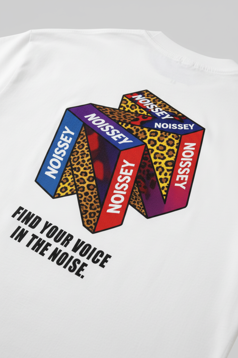 Back Graphic: High-Definition 3D Geometric "NOISSEY" Logo with Leopard Accents & Slogan